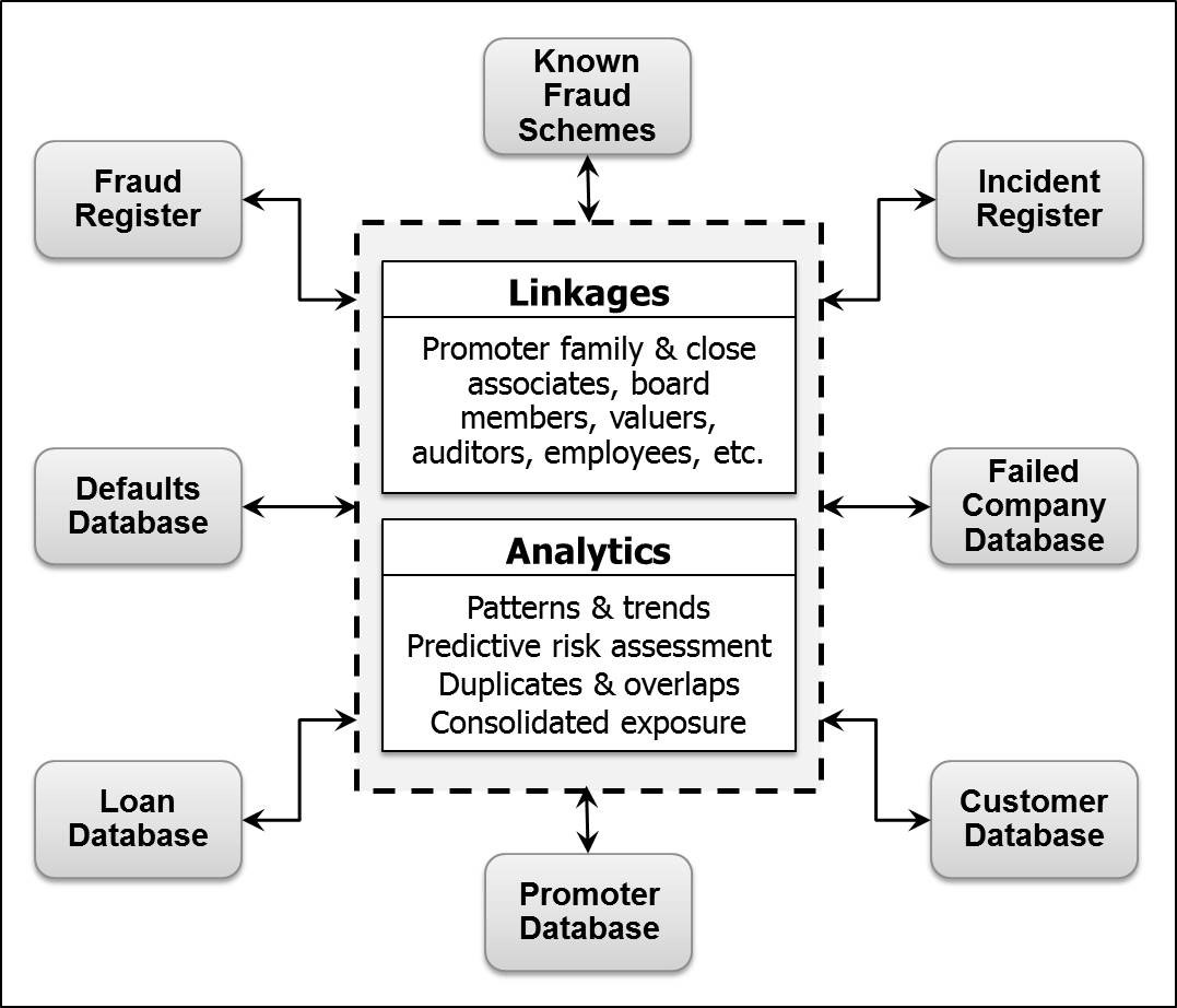 The above graphic outlines the concept of a central anti-fraud system. The system must be adaptive, and should be able to flag high-risk promoters, companies and loan applications, after taking into consideration the linkages mentioned in the graphic. In time, it should be able to take in loan application details and give it a risk rating.